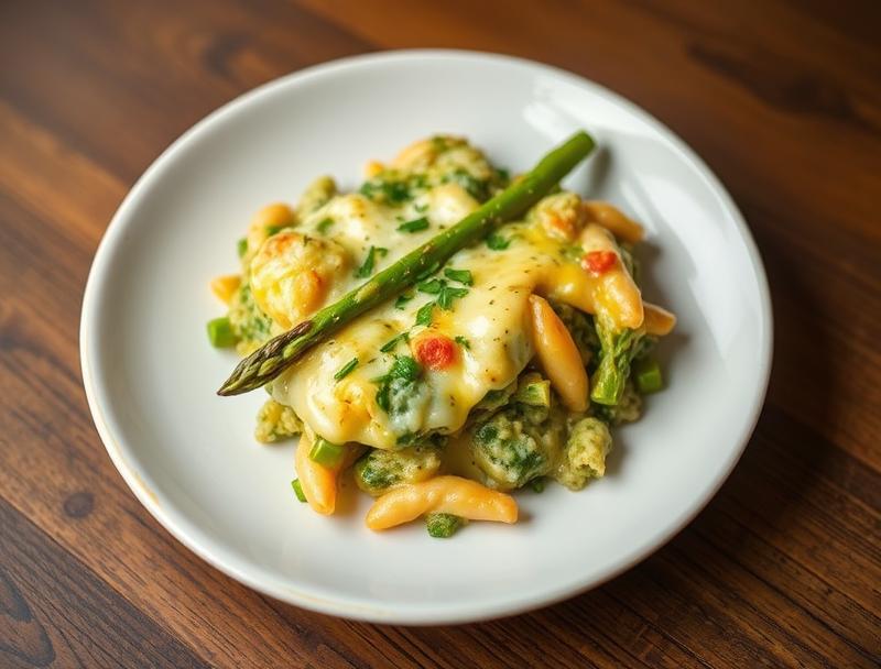 A rich and satisfying casserole combining tender asparagus, creamy cheese sauce, and a crunchy topping.